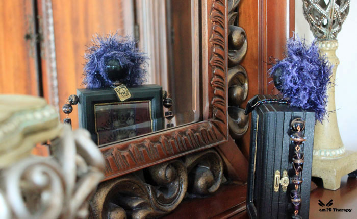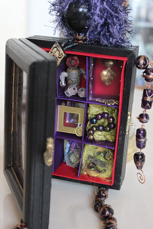 The crystal figurine reminds me that I have an inner child who needs to come out and play from time to time. It keeps my imagination alive. The beads remind me that it’s OK to enjoy some of the finer things in life, and that I don’t have to wait until I’m old to wear purple. The bottom compartments hold the cutest little handbag, one of my favorite things, and the word “wisdom”, which is something I have prayed for on more than one occasion. If wisdom is truly linked to gray hair, I have a lot – of wisdom. Although you can’t actually see treasures in the remaining compartments, I don’t think of them as being empty, but rather, yet to be filled. It’s a reminder that I still have room for growth, and discovery, and for living life.